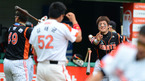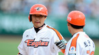 [OSEN=대전,지형준 기자] 현충일인 6일 오후 대전구장에서 열린 '2012 팔도 프로야구' 한화 이글스와 롯데 자이언츠의 경기, 5회말 무사 2루에서 한화 강동우가 1타점 적시타를 날리고 최만호 코치와 주먹을 맞대고 있다. 이날 한화
