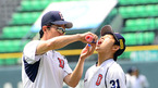 [OSEN=잠실,박준형 기자] 6일 오후 서울 잠실구장에서 열리는 2012 팔도 프로야구 두산 베어스와 SK 와이번스의 경기 전 두산 김민호 코치가 정수빈에게 과일주스를 먹였다. 정수빈이 과일주스를 흘리자 김민호 코치가 장난치고