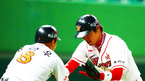 [OSEN=인천, 민경훈 기자] 8일 오후 인천 문학구장에서 열린 '2012 팔도 프로야구' SK 와이번스와 삼성 라이온즈의 경기에서 5회말 2사 주자 3루 SK 이호준이 좌월 투런 홈런을 날린 후 1루에서 정경배 코치와 하이파이브를 하고 있다