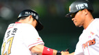 [OSEN=인천, 민경훈 기자] 8일 오후 인천 문학구장에서 열린 '2012 팔도 프로야구' SK 와이번스와 삼성 라이온즈의 경기에서 5회말 2사 주자 3루 SK 이호준이 좌월 투런 홈런을 날린 후 3루에서 이광근 코치와 하이파이브를 하고 있다