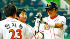 [OSEN=인천, 민경훈 기자] 8일 오후 인천 문학구장에서 열린 '2012 팔도 프로야구' SK 와이번스와 삼성 라이온즈의 경기에서 5회말 2사 주자 3루 SK 이호준이 좌월 투런 홈런을 날린 후 홈에서 최정과 하이파이브를 하고 있다. 이 날