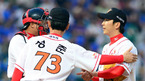 [OSEN=문학, 곽영래 기자] 9일 오후 인천 문학구장에서 열린 '2012 팔도 프로야구' SK 와이번스와 삼성 라이온즈의 경기, 8회초 2사 1,2루삼성 이승엽의타석때SK 성준 코치가 마운드에 올라 정우람을 진정시키고 있다. 삼성 라이온즈