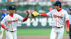 [OSEN=문학, 곽영래 기자] 9일 오후 인천 문학구장에서 열린 '2012 팔도 프로야구' SK 와이번스와 삼성 라이온즈의 경기, 7회초 1사 1루 진갑용의 강습타구를 SK 최정이병살로 연결시켜 이닝이 끝나자 박희수가 최정과 하이파이브를