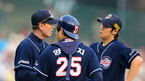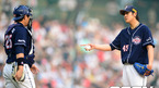 [OSEN=잠실,지형준 기자] 9일 오후 잠실구장에서 열린 '2012 팔도 프로야구' LG 트윈스와 두산 베어스의 경기, 5회말 무사 1,2루에서 두산 양의지가 마운드에 올라 이용찬과 이야기를 나누고 있다. 이용찬은 강판되며 정대현과 교체.
