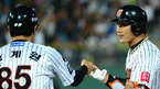 [OSEN=부산, 이대선 기자] 9일 오후 부산 사직야구장에서 열린 '2012 팔도 프로야구' 롯데 자이언츠와 KIA 타이거즈의 경기, 8회말 1사 2루 롯데 김주찬이 중전 1타점 역전 적시타를 치고 박계원 코치와 하이파이브를 하고 있다. 지난