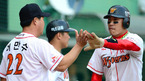 [OSEN=문학, 곽영래 기자] 9일 오후 인천 문학구장에서 열린 '2012 팔도 프로야구' SK 와이번스와 삼성 라이온즈의 경기, 4회말 1사 2루 SK 정상호의 좌전안타로 김강민이 득점 성공후 이만수 감독과 하이파이브를 하고 있다. 장원삼