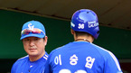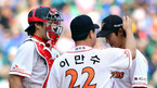 [OSEN=문학, 곽영래 기자] 9일 오후 인천 문학구장에서 열린 '2012 팔도 프로야구' SK 와이번스와 삼성 라이온즈의 경기, 4회초 1사 만루 SK 이만수 감독이 투수교체를 위해 마운드에 올라 허준혁과 이야기를 나누고 있다. 장원삼은 4