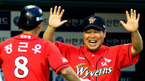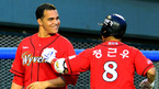 [OSEN=잠실, 곽영래 기자] 12일 오후 서울 잠실구장에서 열린 '2012 팔도 프로야구' LG 트윈스와 SK 와이번스의 경기, 3회초 1사 2루 SK 정근우가 좌측 담장을 넘기는 2점 홈런을 치고 이만수 감독과 기뻐하고 있다. SK와 LG는 12일 잠실