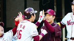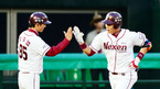 [OSEN=목동, 민경훈 기자] 12일 오후 목동구장에서 열린 '2012 팔도 프로야구' 넥센 히어로즈와 KIA 타이거즈의 경기에서 4회말 2사 주자 2루 넥센 강정호가 좌월 투런 홈런을 날린 후 덕아웃에서 김병현과 하이파이브를 하고 있다.