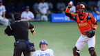 [OSEN=대구 ,백승철 기자] 12일 오후 대구 시민구장에서 열린 '2012 팔도 프로야구' 삼성 라이온즈와 한화 이글스의 경기 1회말 2사 1,2루 진갑용의 우익수 앞 1루타에 홈으로 쇄도하던 2루주자 최형우가 홈에서 태그아웃되고 있다.