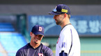 [OSEN=부산,박준형 기자] 12일 오후 부산 사직구장에서 열리는 2012 팔도 프로야구 롯데 자이언츠와 두산 베어스의 경기 전 두산 김진욱 감독이 이종욱과 이야기를 나누고 있다 두산은 이날 셋업맨 노경은 다시 선발로 등판시켜
