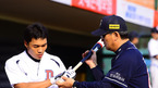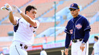 [OSEN=부산,박준형 기자] 12일 오후 부산 사직구장에서 열리는 2012 팔도 프로야구 롯데 자이언츠와 두산 베어스의 경기 전 두산 김진욱 감독이 이종욱의 타격자세를 교정하고 있다. 두산은 이날 셋업맨 노경은 다시 선발로 등판