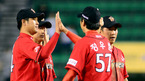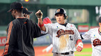 [OSEN=부산,박준형 기자] 12일 오후 부산 사직구장에서 열린 2012 팔도 프로야구 롯데 자이언츠와 두산 베어스의 경기 연장 11회말 1사 2루 롯데 정보명의 동점 적시타때 2루 주자 황재균이 동점 득점을 올린후 동료들의 축하를 받