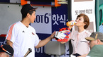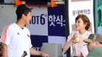 [OSEN=부산,박준형 기자] 12일 오후 부산 사직구장에서 열리는 2012 팔도 프로야구 롯데 자이언츠와 두산 베어스의 경기 전 롯데 황재균이 공서영 KBS N 아나운서에게 장난을 치고 있다 두산은 이날 셋업맨 노경은 다시 선발로 등판