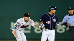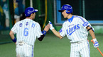 [OSEN=대구 ,백승철 기자] 13일 오후 대구 시민구장에서 열린 '2012 팔도 프로야구' 삼성 라이온즈와 한화 이글스의 경기 5회말 1사 1,2루 김상수의 1타점 적시타에 홈을 밟은 손주인이 덕아웃으로 향하며 배영섭과 하이파이브를 하
