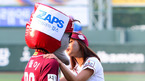 [OSEN=목동, 민경훈 기자] 13일 오후 목동구장에서 열린 '2012 팔도 프로야구' 넥센 히어로즈와 KIA 타이거즈의 경기에서 가수 김소리가 시구를 한 후 턱돌이에게 입맞춤을 하고 있다. 이 날 넥센과 KIA는 각각 김영민(25)과 서재응(35)