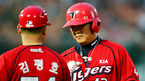 [OSEN=목동, 민경훈 기자] 13일 오후 목동구장에서 열린 '2012 팔도 프로야구' 넥센 히어로즈와 KIA 타이거즈의 경기에서 4회초 1사 3루에서 KIA 송산이 좌익수 앞 1타점 적시타를 날린 후 1루에서 김평호 코치와 하이파이브를 하고 있