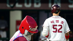 [OSEN=목동, 곽영래 기자] 15일 오후 서울 목동구장에서 열린 '2012 팔도 프로야구' 넥센 히어로즈와 롯데 자이언츠 경기, 5회말 1,2루 넥센 턱돌이가 떨어진 박병호의 배트를 주워 박병호에게 전달해주고 있다. 팀을 대표하는 두 외
