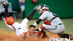 [OSEN=대전, 지형준 기자] 20일 오후 대전구장에서 열린 '2012 팔도 프로야구' 한화 이글스와 LG 트윈스의 경기, 3회말 1사 2루에서 한화 양성우가 백승룡의 2루타에 홈에서 LG 김태군의 블로킹에 막혀 태그아웃당하고 있다. 이날 한