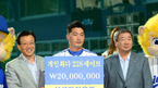 [OSEN=대구, 이대선 기자] 24일 오후 대구야구장에서 열린 '2012 팔도 프로야구' 삼성 라이온즈와 SK 와이번스의 경기, 클리닝타임때 삼성 오승환이 KBO 최다세이브 시상식에서 구본능 총재에게 상패를 받고 있다. 오승환은 지난 1일