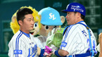 [OSEN=대구, 이대선 기자] 24일 오후 대구야구장에서 열린 '2012 팔도 프로야구' 삼성 라이온즈와 SK 와이번스의 경기, 클리닝타임때 삼성 오승환이 KBO 최다세이브 시상식에서 진갑용에게 꽃다발을 받고 있다. 오승환은 지난 1일 대
