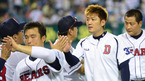 [OSEN=잠실 ,백승철 기자] 25일 오후 서울 잠실구장에서 열린 '2012 팔도 프로야구' 두산 베어스와 LG 트윈스의 경기 종료 후 김선우가 동료들과 하이파이브를 하고 있다. 두산은 이날 벌어진 LG전서 6이닝 3실점으로 제 몫을 한 선발