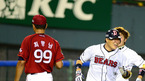 [OSEN=대전, 김영민 기자] 3일 대전구장에서 열린 '2012 팔도 프로야구' 한하 이글스와 SK 와이번스 경기 8회말 2사 만루 6-7로 지고 있는 상황에서 장성호 싹슬이 재역전 안타를 날리며 진루하고 있다. 한화 2년차 좌완 유창식(20)과 S