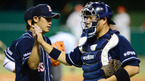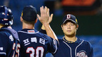 [OSEN=대전 ,백승철 기자] 8일 오후 대전구장에서 열린 '2012 팔도 프로야구' 한화 이글스와 두산 베어스의 경기 종료 후 프록터와 양의지가 하이파이브를 하고 있다. 두산은 이날 열린 한화와의 원정경기에서 선발 이용찬이 7이닝