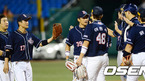 [OSEN=대전 ,백승철 기자] 8일 오후 대전구장에서 열린 '2012 팔도 프로야구' 한화 이글스와 두산 베어스의 경기 종료 후 두산 선수들이 하이파이브를 하고 있다. 두산은 이날 열린 한화와의 원정경기에서 선발 이용찬이 7이닝 2실