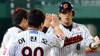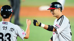 [OSEN=대구, 민경훈 기자] 4일 오후 대구 시민구장에서 열린 '2012 팔도 프로야구' 삼성 라이온즈와 LG 트윈스의 경기에서 3회초 1사 주자 2루 LG 박용택이 중견수 앞 1타점 적시타를 날린 후 1루에서 김인호 코치와 하이파이브를 하