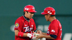 [OSEN=부산 ,백승철 기자] 4일 오후 부산 사직구장에서 열린 '2012 팔도 프로야구' 롯데 자이언츠와 KIA 타이거즈의 경기 1회초 2사 1,2루 안치홍이 1타점 2루타를 친 후 김평호 코치에게 보호장비를 건내고 있다. 4강 진입의 갈림길에