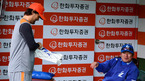 [OSEN=대전,지형준 기자] 12일 오후 대전구장에서 열린 '2012 팔도 프로야구' 한화 이글스와 삼성 라이온즈의 경기, 경기에 앞서 한화 박찬호가 삼성 류중일 감독에게 사인을 받고 인사를 나누고 있다. 이날 한화는 류현진, 삼성은