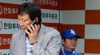 [OSEN=대전,지형준 기자] 13일 오후 대전구장에서 열릴 예정이던 '2012 팔도 프로야구' 한화 이글스와 삼성 라이온즈의 경기가 우천으로 연기됐다. 서정환 경기 감독관이 류중일 감독에게 우천 연기를 알리고 전화 통화를 하고 있