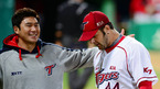 [OSEN=광주 ,백승철 기자] 29일 오후 광주 무등구장에서 열린 '2012 팔도 프로야구' KIA 타이거즈와 SK 와이번스의 경기 6회말 2사 김상현을 내야땅볼로 처리한 윤희상이 조인성을 바라보며 미소를 짓고 있다. KIA 외국인 투수 앤서니
