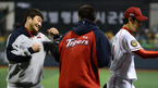 [OSEN=군산,박준형 기자] 2일 오후 전북 군산구장에서 열린 2012 팔도 프로야구 KIA 타이거즈와 롯데 자이언츠의 경기 3회초 KIA 서재응과 김진우가 더그아웃으로 들어가는 윤석민과 하이파이브 후 장난을 치고 있다. 이날 KIA와 롯데