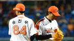 [OSEN=대전, 이대선 기자] 3일 오후 대전 한밭야구장에서 열린 '2012 팔도 프로야구' 한화 이글스와 KIA 타이거즈의 경기, 6회초 종료 후 한화 박찬호가 포수 박노민을 격려하고 있다. 한화와 KIA는 각각 박찬호와 양현종을 선발로 내