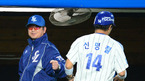 [OSEN=대구, 이대선 기자] 4일 오후 대구야구장에서 열린 '2012 팔도 프로야구' 삼성 라이온즈와 SK 와이번스의 경기, 7회말 2사 2루 삼성 류중일 감독이 배영섭의 중전 동점 적시타때 홈을 밟은 신명철과 하이파이브를 하고 있다. 삼