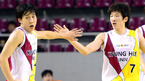 [OSEN=용인실내체육관, 곽영래 기자] 4일 오후 경기도 용인 실내체육관에서 열린 '2012 KB 국민은행 대학농구리그' 챔피언 결정전 2차전 경희대와 중앙대의 경기 4쿼터, 경희대 김영현이 득점을 올리고 두경민과 기뻐하고 있다. 디