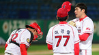 [OSEN=광주, 이대선 기자] 6일 오후 광주 무등야구장에서 열린 '2012 팔도 프로야구' KIA 타이거즈와 삼성 라이온즈의 경기, 6회초 2사 1,3루 마운드를 방문한 KIA 이강철 코치가 서재응과 이야기를 하고 있다. KIA 서재응은 삼성과의