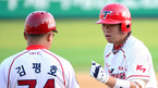 [OSEN=광주, 이대선 기자] 6일 오후 광주 무등야구장에서 열린 '2012 팔도 프로야구' KIA 타이거즈와 삼성 라이온즈의 경기, 1회말 무사 1,2루 KIA 안치홍이 좌전 적시타를 치고 김평호 코치와 하이파이브를 하고 있다. KIA 서재응은 삼