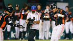 [OSEN=잠실,이대선 기자] 8일 오후 서울 잠실구장에서 열린 2012 팔도 프로야구 준플레이오프 1차전 두산 베어스(3위)와 롯데 자이언츠(4위)의 경기, 8회초 1사 1루에서 롯데 박준서가 우월 동점 투런홈런을 치고 더그아웃에서 동료