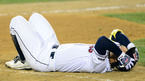 [OSEN=잠실,손용호 기자] 8일 오후 서울 잠실야구장에서 열린 2012 팔도프로야구 준PO1차전 두산 베어스와 롯데 자이언츠의 경기 7회말 홈송구 볼에 얼굴을 맞은 강민호의 볼이 부어 있다. 준플레이오프 1차전 두산은 외국인 에이스