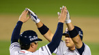 [OSEN=잠실,손용호 기자] 8일 오후 서울 잠실야구장에서 열린 2012 팔도프로야구 준PO1차전 두산 베어스와 롯데 자이언츠의 경기 5회말 2사 윤석민의 적시타로 홈을 밟은 김현수가 동료들의 환영을 받고 있다. 준플레이오프 1차전