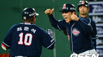 [OSEN=부산,지형준 기자] 11일 오후 부산 사직구장에서 열린 2012 팔도 프로야구 준플레이오프 3차전 두산 베어스와 롯데 자이언츠의 경기, 1회초 2사 1루에서 두산 최준석이 좌월 투런포를 날리고 홈을 밟자 1루주자 김현수가 기뻐