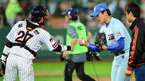 [OSEN=부산,지형준 기자] 12일 오후 부산 사직구장에서 열린 2012 팔도 프로야구 준플레이오프 4차전 두산 베어스와 롯데 자이언츠의 경기, 경기에 앞서 시구자로 나선 2013 롯데 신인 1번 부산고 송주은이 롯데 용덕한과 주먹을 맞
