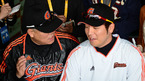 [OSEN=인천, 민경훈 기자] 16일 오후 인천 문학구장에서 열린 2012 팔도 프로야구 플레이오프 1차전 SK 와이번스와 롯데 자이언츠의 경기, 경기에 앞서 롯데 양승호 감독이 기자들과 인터뷰 중 강민호와 어깨동무를 하며 즐겁게 얘