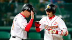 [OSEN=인천,이대선 기자] 17일 오후 인천 문학구장에서 열린 2012 팔도 프로야구 플레이오프 2차전 SK 와이번스와 롯데 자이언츠의 경기, 1회말 1사 1루 SK 최정이 좌월 선제 투런홈런을 치고 더그아웃에서 동료들의 축하를 받고 있다