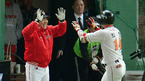 [OSEN=인천 ,백승철 기자] 29일 오후 인천 문학구장에서 열린 '2012 팔도 프로야구' SK 와이번스와 삼성 라이온즈의 한국시리즈 4차전 경기 4회말 1사 최정이 솔로포를 친 후 이만수 감독과 하이파이브를 하고 있다. 지난 28일 열린 3