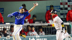 [OSEN=잠실, 민경훈 기자] 1일 오후 서울 잠실구장에서 열린 '2012 팔도 프로야구' 삼성 라이온즈와 SK 와이번스의 한국시리즈 6차전 경기에 앞서 배우 이동욱이 시구를 한 후 조인성에게 시구볼을 받고 있다. 삼성은 지난달 31일 잠