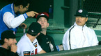 [OSEN=부산 ,백승철 기자] 8일 오후 부산 사직야구장에서 열린 '마구매니저 아시아시리즈 2012' 롯데 자이언츠와 퍼스 히트의 경기 2회말 구대성이 덕아웃에서 한 관계자의 이야기를 듣고 있다. 롯데 자이언츠의 우완 에이스 송승
